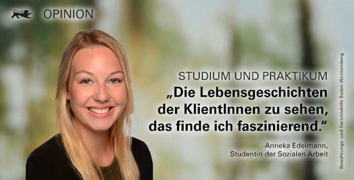 Wir haben mit der Hochschule im 2. Semester eine Justizvollzugsanstalt besucht, das fand ich super spannend und da war mein Interesse für die Arbeit mit Straffälligen geweckt. Auch in weiteren Seminaren ist mir dann das Thema Bewährungshilfe wieder begegnet. Dann habe ich mich entschlossen, mich in diesem Bereich für mein Praxissemester zu bewerben. Auf der Website der BGBW habe ich dazu viele hilfreiche Infos gefunden und mich beworben.