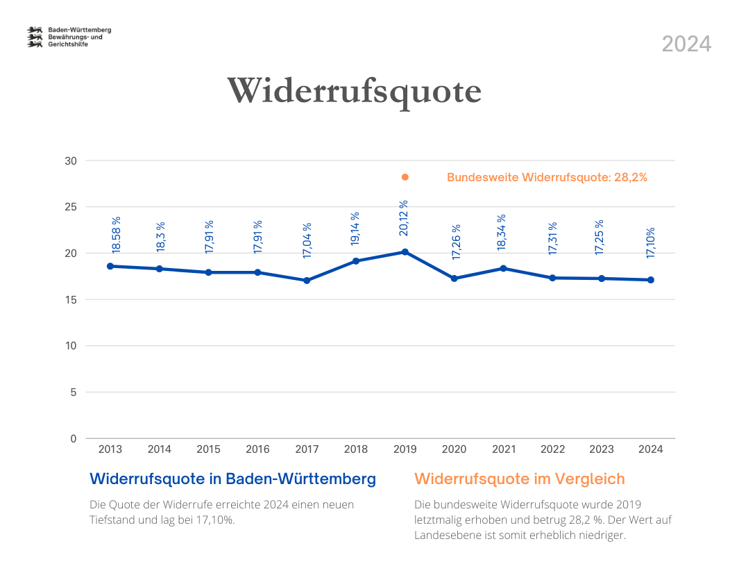 Die Widerrufsquote gibt Aufschluss über die Erfolgsrate der Bewährungen: Sie gibt an, welcher Anteil der Bewährungsstrafen widerrufen wurde (weil neue Straftaten begangen wurden, weil gegen Auflagen und Weisungen verstoßen wurde oder weil Termine mit der Bewährungshilfe nicht eingehalten wurden). In Baden-Württemberg ist die Widerrufsquote seit Jahren deutlich niedriger als im bundesweiten Durchschnitt: Bei der letzten Berechnung der bundesweiten Widerrufsquote im Jahr 2019 lag diese bei durchschnittlich 28,2 Prozent. In Baden-Württemberg betrug sie zuletzt 17,10 Prozent - ein neuer Tiefstwert.