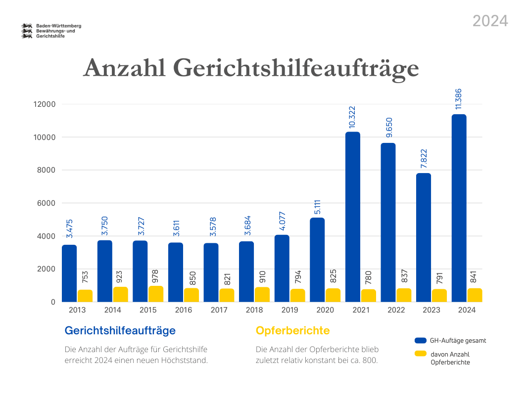 Die Zahl der Gerichtshilfeaufträge ist in den vergangenen Jahren stark gestiegen. Im Jahr 2024 waren es insgesamt 11.386 Aufträge. Hauptgrund für den Anstieg ist ein 2020 angelaufenes Projekt zur Vermeidung von Ersatzfreiheitsstrafen. Mehr zu dem Thema sehen Sie in der Grafik rechts.