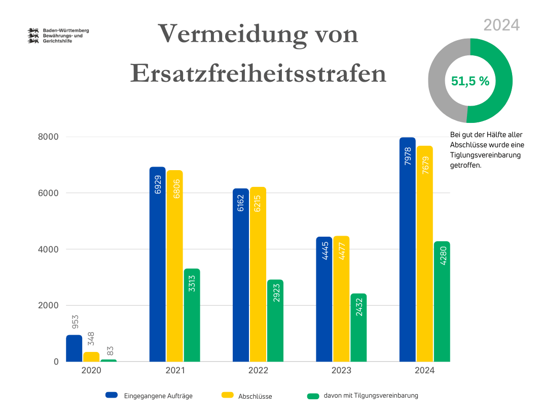 Nach einer mehrmonatigen Pilotphase ist das Projekt zur Vermeidung von Ersatzfreiheitsstrafen (EFS) im November 2020 erfolgreich angelaufen. Seitdem sind mehr als 26.000 Aufträge bei uns eingegangen. In mehr als der Hälfte der Fälle konnte mit den Betroffenen eine Tilgungsvereinbarung getroffen werden. Zuletzt, im Jahr 2024, sind 7.978 bei der BGBW eingegangen.