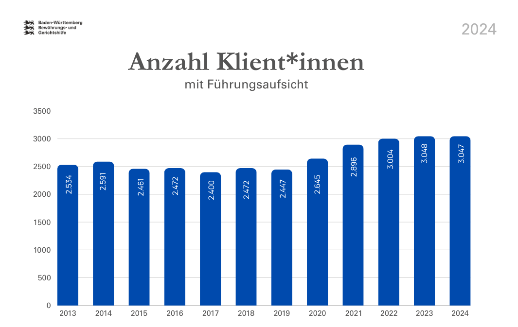 Führungsaufsicht ist eine Maßnahme der Strafvollstreckung. Sie wird angeordnet, wenn die Unterbringung aus dem Maßregelvollzug zur Bewährung ausgesetzt wird. Sie tritt ebenfalls ein, wenn eine längere Freiheitsstrafe verbüßt wurde und/oder das Gericht das Risiko einer erneuten Straffälligkeit als hoch einschätzt. Die Zahl unserer Klient*innen mit Führungsaufsicht hat in den vergangenen Jahren deutlich zugenommen. In den Jahren 2023 bzw. 2024 konnten wir einen Höchststand 3.048 bzw. 3.047 Klient*innen verzeichnen.