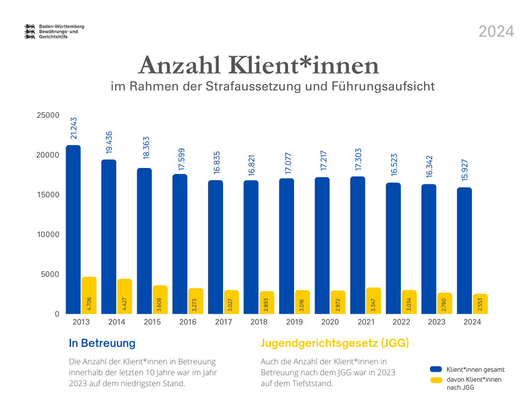 Die Zahl der Klient*innen im Bereich Bewährungshilfe (Strafaussetzung und Führungsaufsicht) ist in den vergangenen zehn Jahren um mehr als 25 Prozent gesunken: Waren es 2013 noch 21.243 Klient*innen, hatten wir zuletzt, im Jahr 2024, nur noch 15.927. Bei den nach Jugendgerichtsgesetz Unterstellten ist der Rückgang noch signifikanter und liegt bei über 45 Prozent.