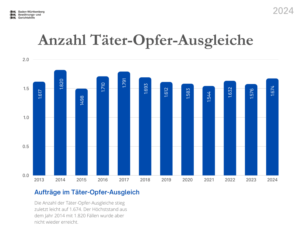 Die Zahl der Täter-Opfer-Ausgleiche stieg 2024 leicht auf 1.674 Fälle. Das Potential an Fällen, in denen ein TOA geeignet wäre, ist wesentlich größer. Auch im internationalen Vergleich bewegen sich unsere Zahlen auf relativ niedrigem Niveau. Regional sind zum Teil große Unterschiede zu beobachten.