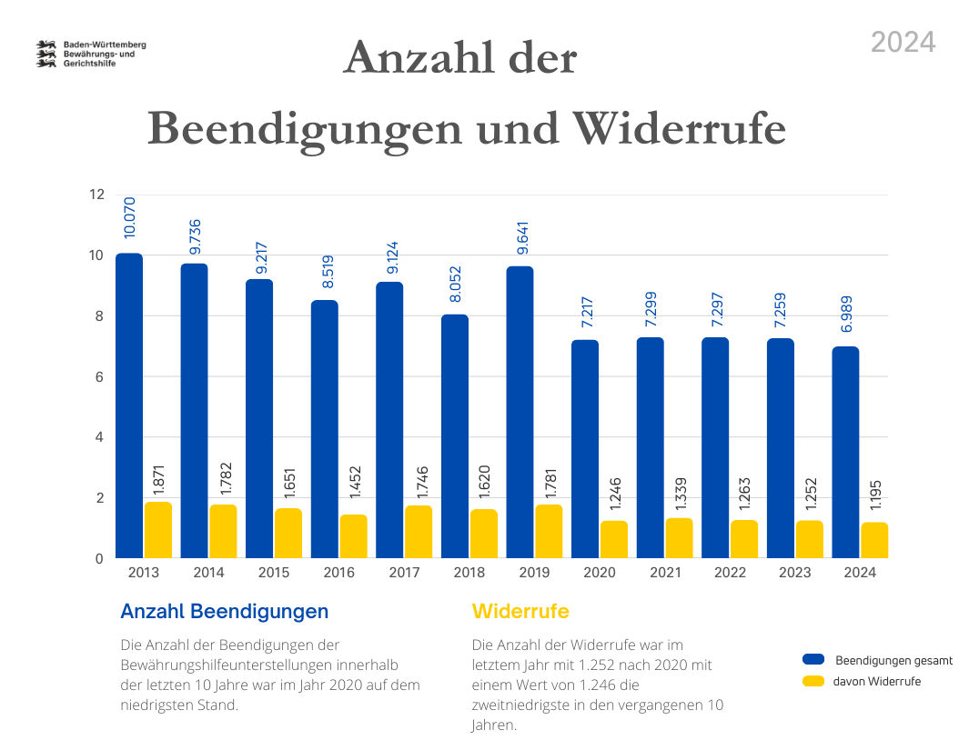 Eine Unterstellung endet entweder mit der erfolgreichen Beendigung der Bewährungsstrafe oder mit einem Widerruf der Bewährung. Ein Bewährungswiderruf kann erfolgen, wenn der Verurteilte während der Bewährungszeit erneut straffällig wird oder er gegen die ihm auferlegten Bewährungsauflagen verstößt. Die Zahl der Beendigungen lag zuletzt, also 2024, bei 6.989. Bei 1.195 erfolgte die Beendigung aufgrund eines Bewährungswiderrufes (17,10 Prozent).
